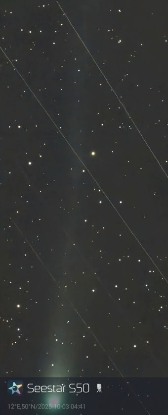 Am 15. Dezember zeigte der insterstellare 3I ATLAS auf einer Seestar-Aufnahme mit 8 Minuten Beleichtungszeit einen Schweif. Die gekräuselte Linie darüber ist ein Kondensstreifen.