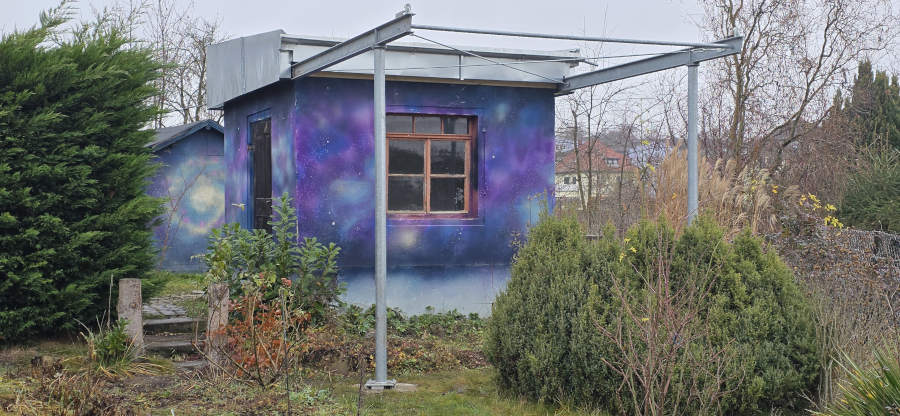 Seit Frühling 2022 gibt es in der Gartenanlage Einheit den Sternengarten. Beobachtet wird mit Dobsons auf der Wiese. Die Dobsons werden auch häufig bei Veranstaltungen am Vereinsheim eingesetzt. Zwischendurch schwebte auch immer die Idee, die Gartenlaube in eine Sternwarte umzubauen. Dieses Projekt stieß auf Unterstützung des Vereinsvorstandes, insbesondere der Vorsitzenden Grit Martinez. Am Nachmittag vor der Beobachtung zum Astronomietag am 28.10.2023 gab es ein Brainstorming, an dem sich neben Mitgliedern von Astronomieverein und Gartenverein auch Künstler*innen beteiligten. Grit gelang es dann, Anfang 2024 Fördermittel aus dem TRAFO-Programm zu beschaffen und die Firma Kohlbach wurde mit dem Bau einer Metallkonstruktion für ein abfahrbares Dach beauftragt.
