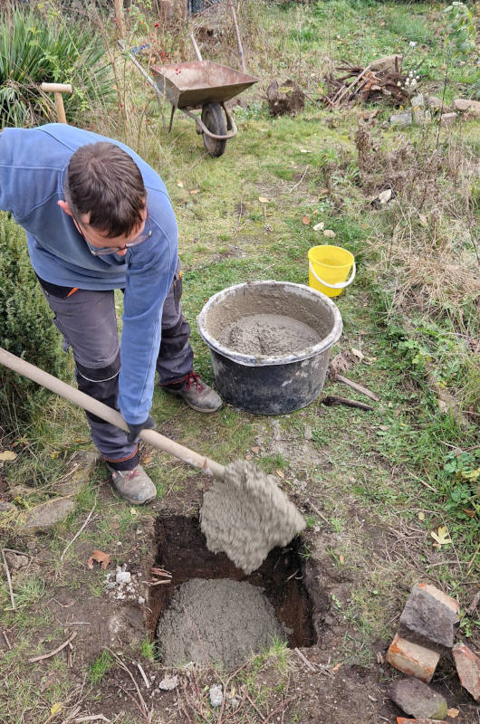 Beim letzten Arbeitseinsatz zur Vorbereitung für das Aufsetzen der Dachkonstruktion wurden am 24.11.24 zwei Fundamente für Stützen gegossen. Die Gruben erscheinen winzig, aber wir brauchten für beide Fundamente den Inhalt von neun 40kg-Säcken Fertigbeton.