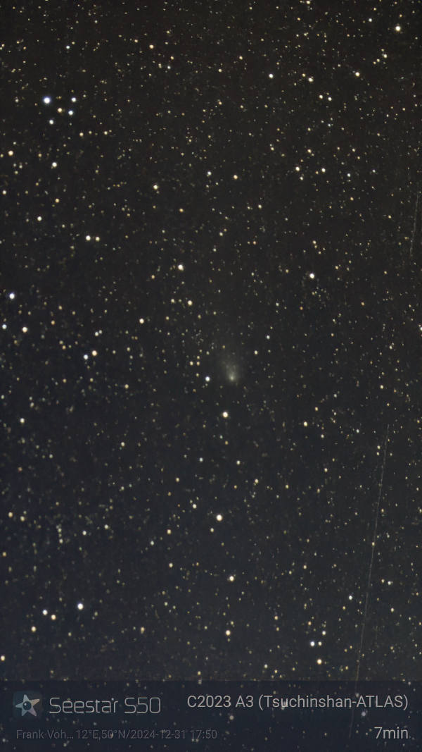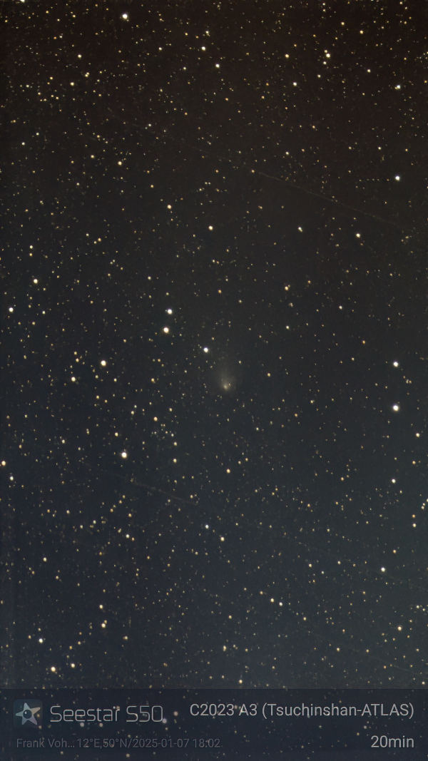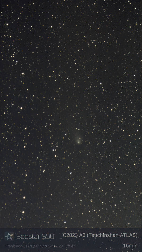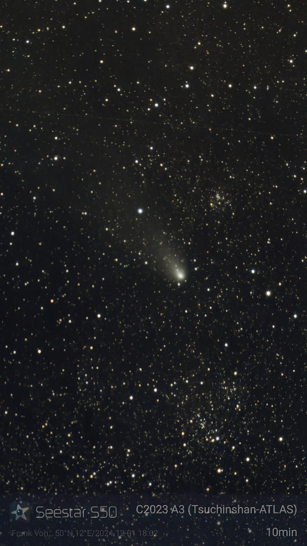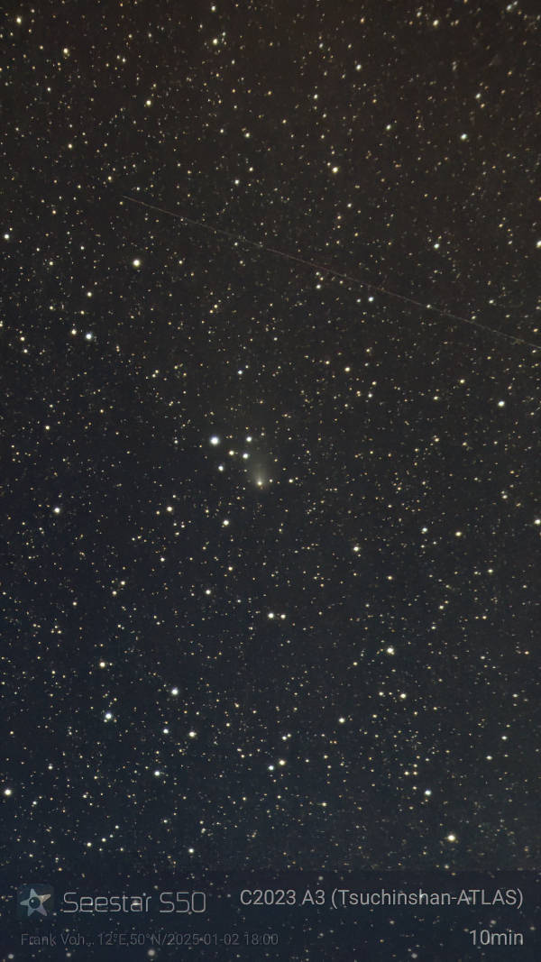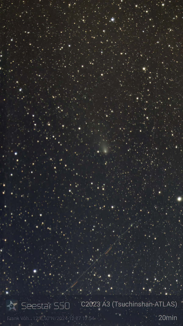 Am 27.12. war der Abendhimmel mit Kondensstreifen zugeschmiert, aber immerhin war etwas zu sehen. Auf einer Aufnahme mit dem Seestar ist der Komet immer noch gut mit seinem Schweif erkennbar, obwohl die Helligkeit unter die zehnte Größenklasse abgesunken war und der Komet wieder horizontnäher stand, als im November.