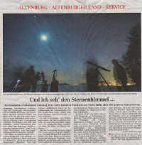 Im August 2025 gab es in Altenburg drei Veranstaltungen mit astronomischen Beobachtungen, am 10.8. eine Sonnenbeobachtung zum Kinderfest auf der Teehauswiese, einen Sternenführung mit Peter Kroll (Sonneberg) am 16.8. in der Gartenanlage Einheit