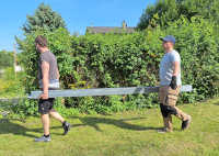 Die Fa. Kohlbach lieferte am 13. Juni 2025 die Teile für die Mechanik des abfahrbaren Daches an. Diese mussten noch vom Vereinsheim zum Sternengarten getragen werden.