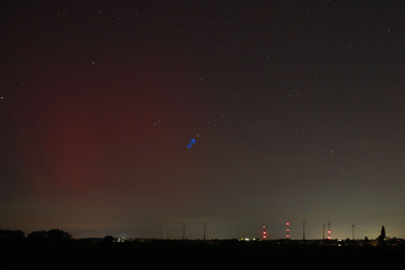 Bei 200 mm Brennweite ist der Komet besser erkennbar und das Rot des Polarlichts ist noch da. Komet und Polarlicht in einem Bild dürfte ein Novum für das Altenburger Land sein.
