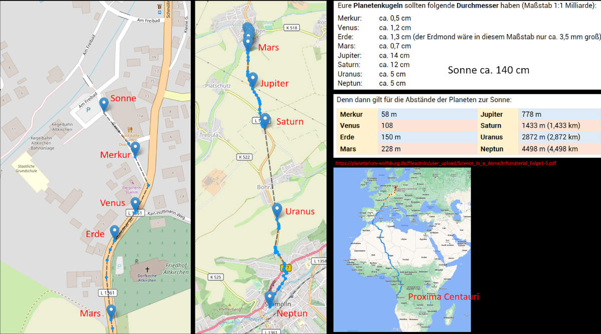 Planetenwege eignen sich gut zur Veranschaulichung der Größenverhältnisse im Sonnensystem. Die Entfernung Sonne - Neptun passt im Maßstab 1:1 Mrd genau in die Strecke von Altkirchen bis ins Zentrum von Schmölln, der nächstgelegenen Stadt.