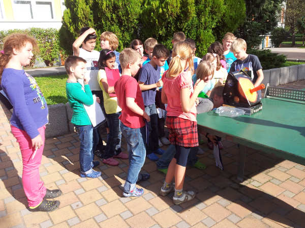 Die Lehrerin Sabine Meisel hatte vor zwei Jahren eine Veranstaltung mit dem AABS im Karolinum organisiert. Im Somer 2014 war sie an die Wilhelm-Busch-Grundschule in Altenburg Nord ausgeliehen und organisierte dort eine Astronomieveranstaltung für die Klasse 4b. Weil Frau Meisel eine Vertretung übernehmen musste, übernahm die Klassenlehrerin der 4b, Anja Kluge, die Betreuung.