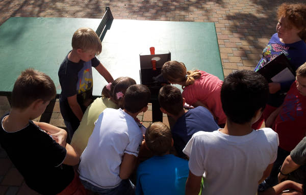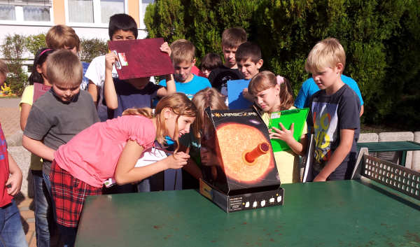 Bei Veranstaltungen mit Kindergruppen hatte sich ein Sonnenprojektor seit Jahren bewährt. Vorteile sind, dass mehrere Menschen gleichzeitig beobachten können, keine Nachfokussierungen auf unterschiedliche Augen nötig sind und dass die Sonnenflecken auf der Projektionsfläche mit einem Finger, Stab oder anderem Gegenstand gezeigt werden können.