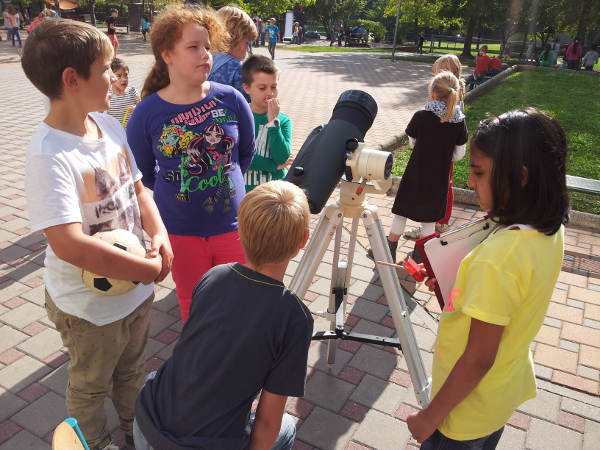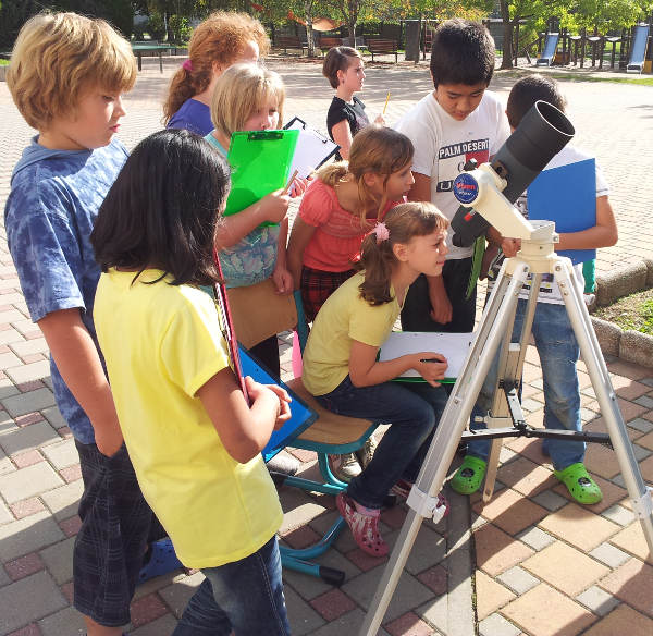 Als der Mond wieder sichtbar wurde, begann die Hofpause. Das Fernrohr blieb zunächst auf die Sonne ausgerichtet, damit auch andere Kinder die Sonnenflecken sehen konnten.