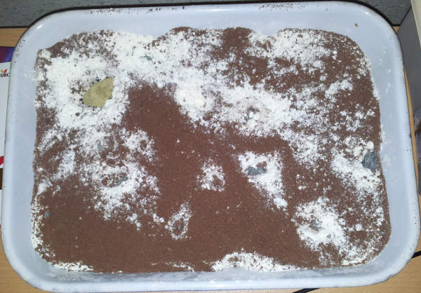 Im Klassenzimmer wurde anschließend das Gesehene aufbereitet. Eine Schale mit Mehl und Kakao diente als Modell der Mondoberfläche. Die Kinder bewarfen dieses mit Steinchen und simulierten so die Erzeugung von Mondkratern durch Meteoriteneinschläge.