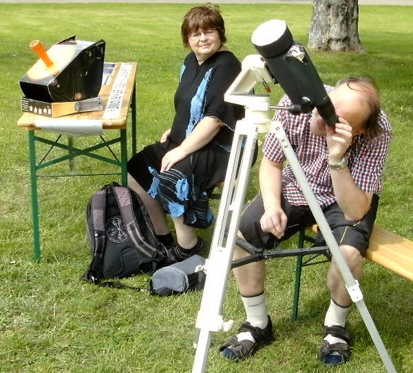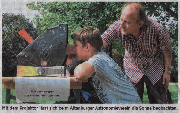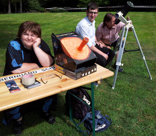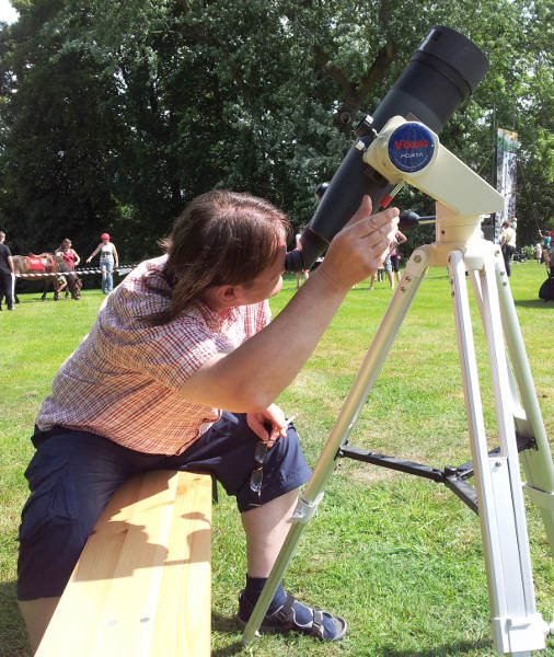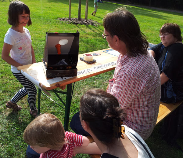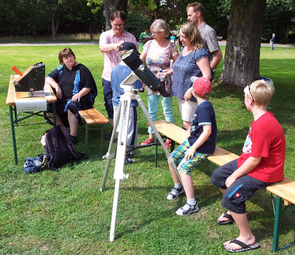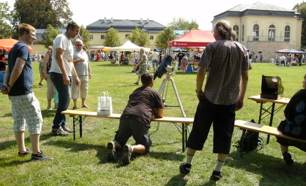Das Stativ war auf eine für Kinder geeignete Höhe eingestellt. Erwachsene nahmen teilweise kuriose haltungen ein, um bequem beobachten zu können. Im Hintergrund ist das Teehaus zu sehen und rechts der Projektor mit Sonnenbild.