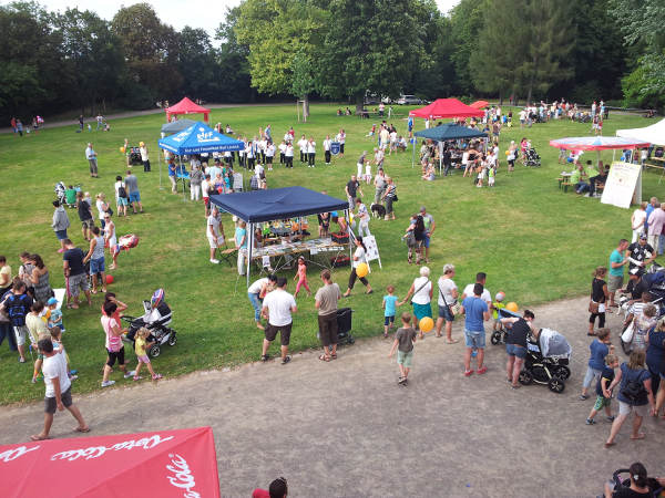 Ein Blick vom Balkon des Teehauses auf den Park. Unser Stand ist in der Mitte am hinteren Rand klein zu sehen.