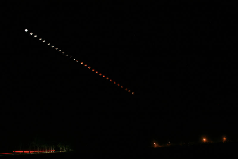 3:07 - Eintritt in den Kernschatten (partielle Finsternis beginnt) bei Positionswinkel=53.6°, Vertikal-Positionswinkel=30.1°, Höhe=32.4°, Azimut=219.7° SW