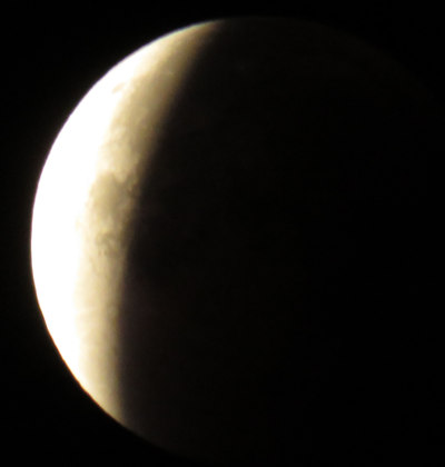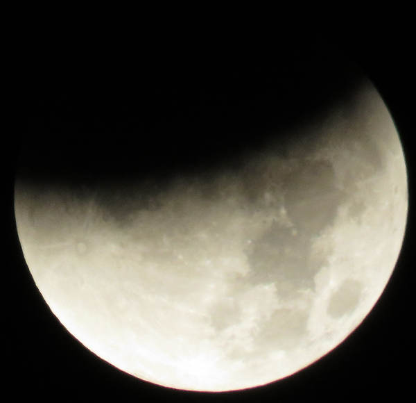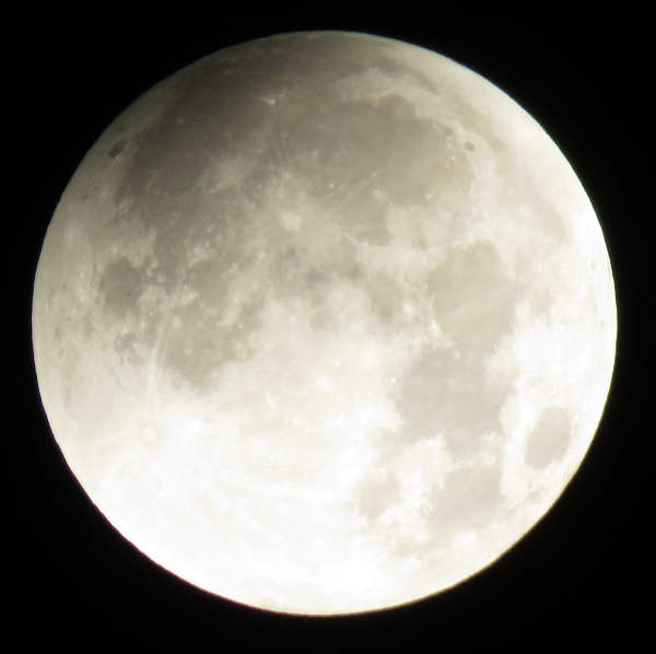 3:02 - Die partielle Phase hat noch nicht begonnen. Trotzdem ist die Verfinsterung durch den Halbschatten schon zu sehen. Vom Mond aus gesehen ist an den verdunkelten Stellen partielle Sonnenfinsternis.