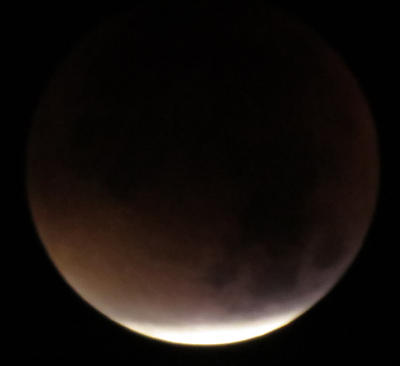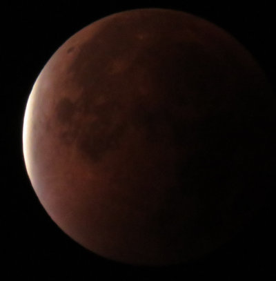 3:58 - Rotes Licht, dass durch die Erdatmosphäre in die Finsterniszone eingestreut wird, ist zu sehen.