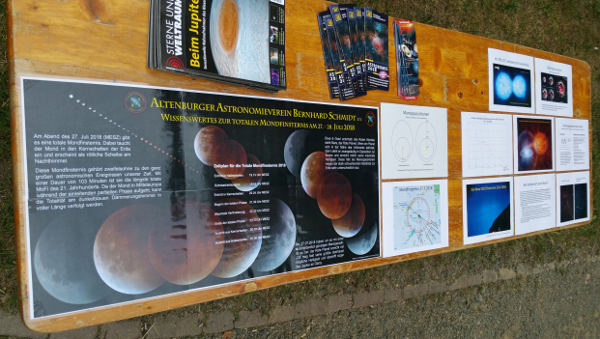 Der Infotisch enthielt drei Themenfelder, links die Mondfinsternis am 27.7. und die gleichzeitig stattfindende Marsopposition und rechts Novae, wofür die Nova V392 Persei den Anlass gab, die am 29.April ausgebrochen war.