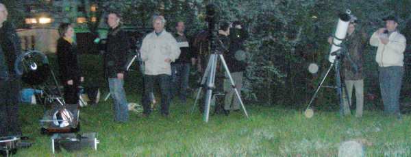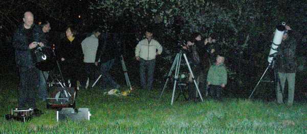 Für gewöhnliche Beobachtungen wäre die Nacht nicht geeignet gewesen. Der Himmel war mit Cirren zugekleistert und der Mond überstralte alles. Die visuelle Grenzgröße lag zwischen 3m und 4m. Mit den geplanten Beobachtungsobjekten ließ sich aus der Not eine Tugend machen. Der Mond wurde in den Teleskopen ordentlich abgebildet und der Saturnring war mit dem Blick auf die Kante gut zu sehen und auch der messerscharfe Schatten des Rings auf dem Planeten. Es wurde reger Gebrauch gemacht von der Möglichkeit, an den Okularen den Mond zu fotografieren.